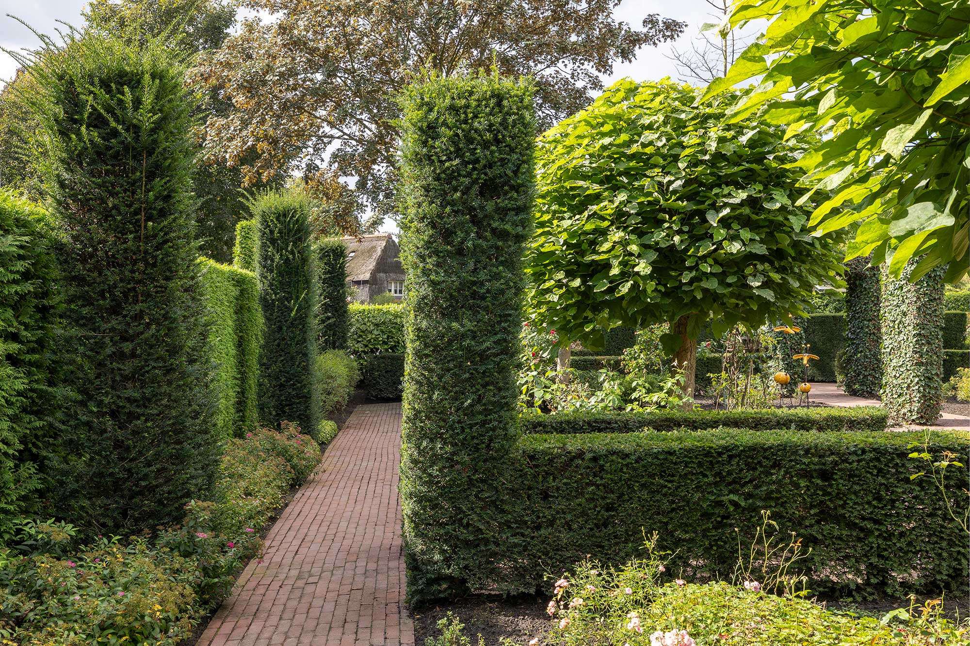 In de professioneel aangelegde tuin geven de groene formaties, waaronder volwassen bolcatalpa’s en geschoren taxussen, het hele jaar door vorm aan de de tuin. De borders, met o.a. botanische rozen, zorgen voor kleur.