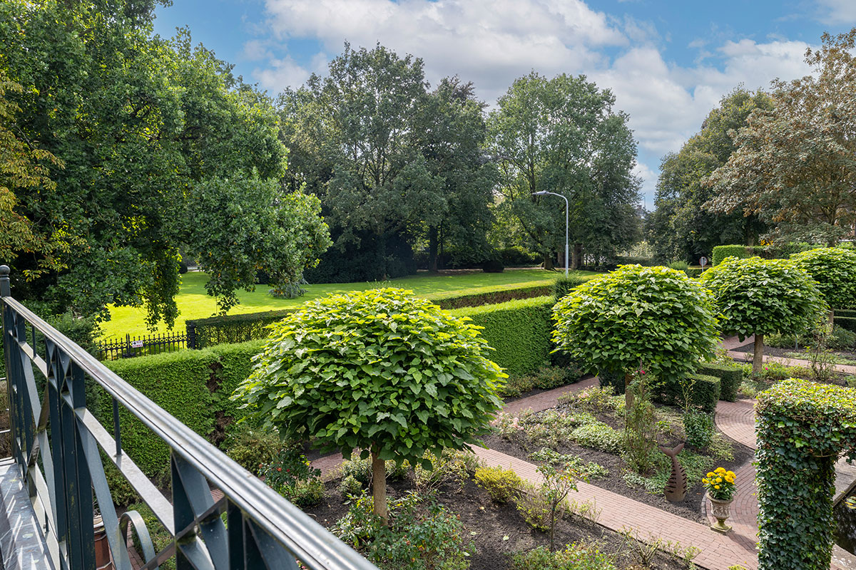 In de professioneel aangelegde tuin geven de groene formaties, waaronder volwassen bolcatalpa’s en geschoren taxussen het hele jaar door vorm aan de de tuin. De borders, met o.a. botanische rozen, zorgen voor kleur.