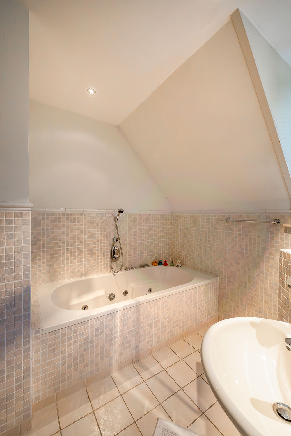 Er is een ruime inloopdouche en een bubbelbad. Ook deze badkamer is voorzien van vloerverwarming.