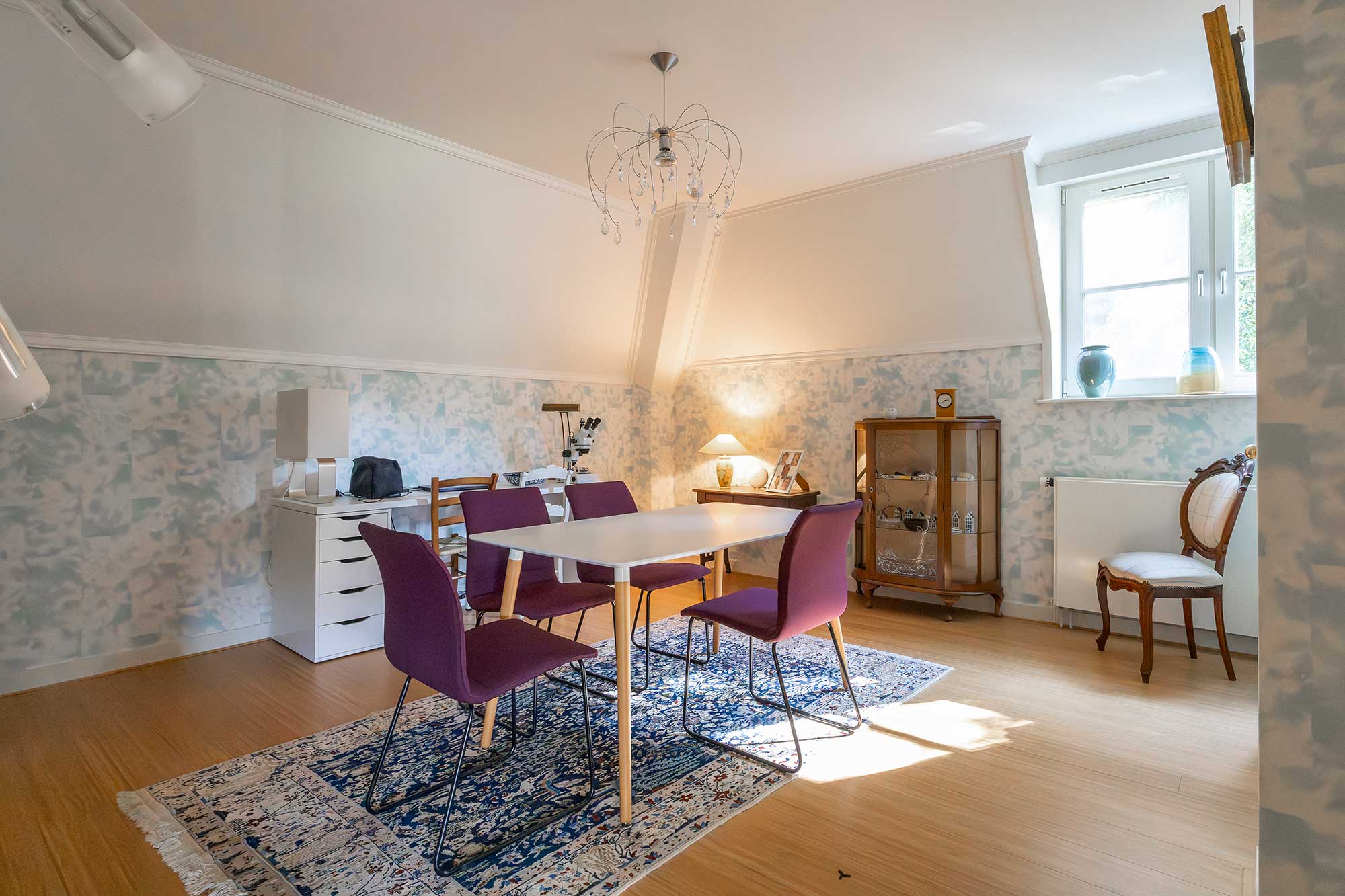 De luxe eetkeuken is ruim en werd in 2019 volledig vernieuwd en vervangen door een hoogwaardige Bulthaup keuken met luxe Miele inbouwapparatuur.