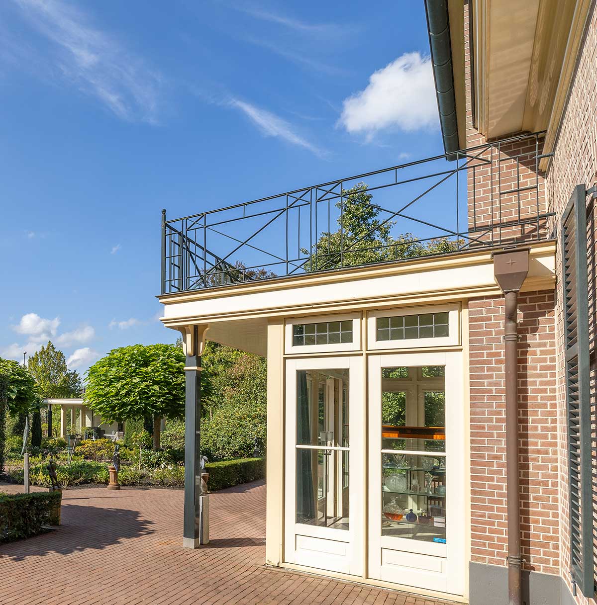 Bijzondere details zoals een smeedijzeren pergola begroeid met druiven, een halfrond terras aan het einde van de tuin – omgeven door gebogen taxuxhagen – en tenslotte een geweldige in stijl gebouwde veranda met houtkachel completeren het geheel.