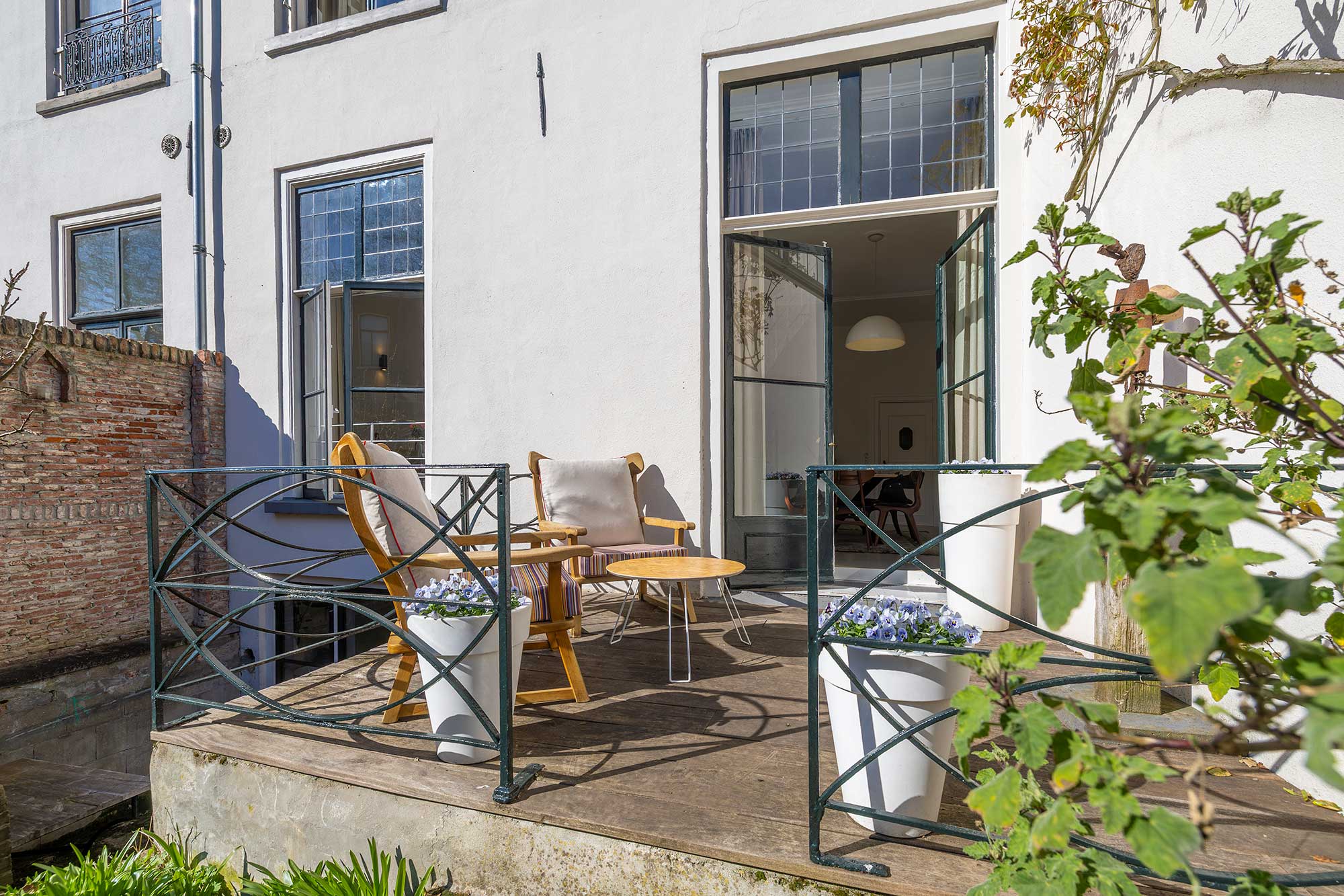 Vanuit de woonkeuken stapt u zo het verhoogde terras op, met uitzicht over de tuin. Een heerlijke plek om te genieten van de ochtend- en middagzon. Het terras wordt omgeven door sierlijke smeedijzeren balusters.