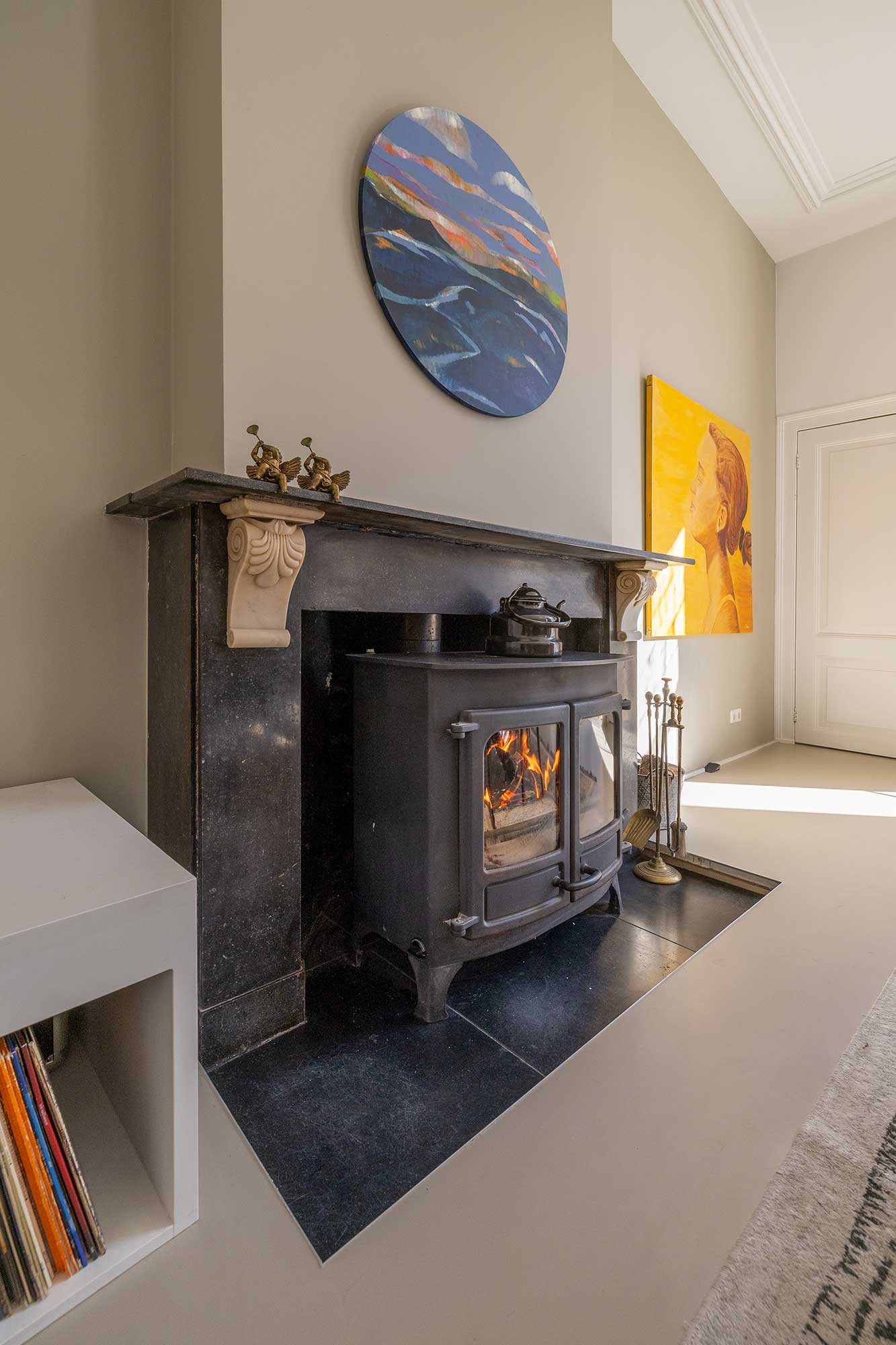 Bij de originele schouw met (CV) houtkachel is ruim plek voor een grote eettafel.