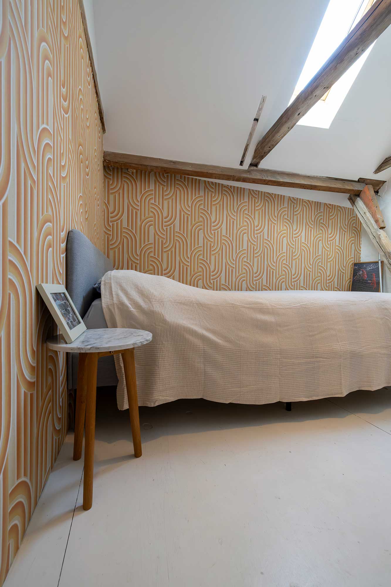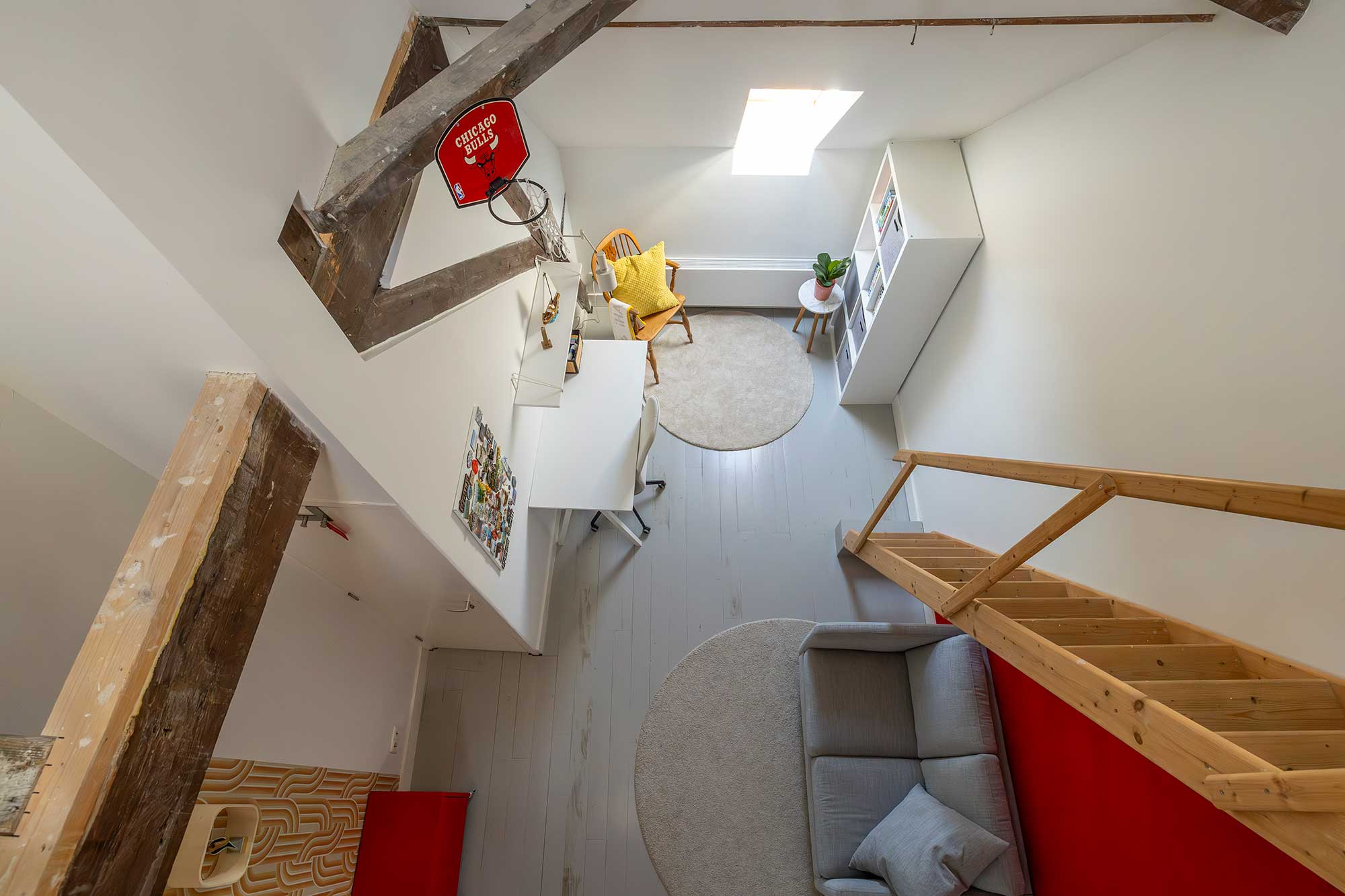 Een van de kamers biedt toegang tot de gezamenlijke ruimte met nr. 45, met middenraam, dakkapel en originele hijsbalk met hijswiel – een uniek historisch detail.