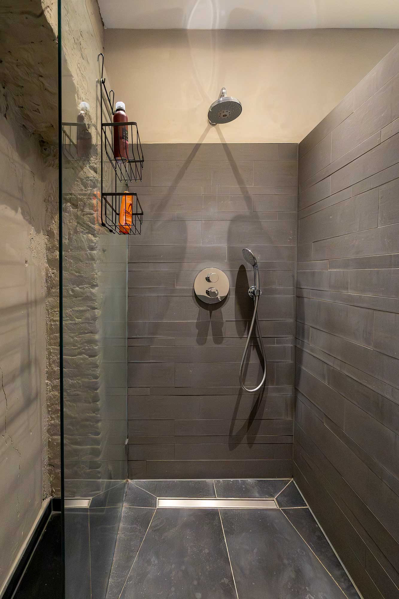 Ruime badkamer met ligbad, inloopdouche en 2 wastafels. Let op de prachtige historische muur.