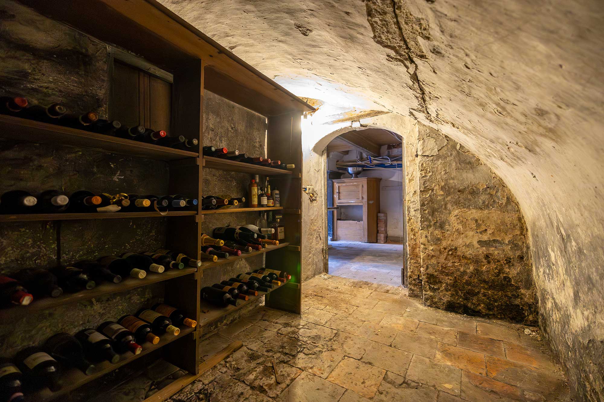 De historische gewelfkelders (met tongewelven) zijn thans in gebruik als wijnkelder – een perfecte plek voor een proeverij.