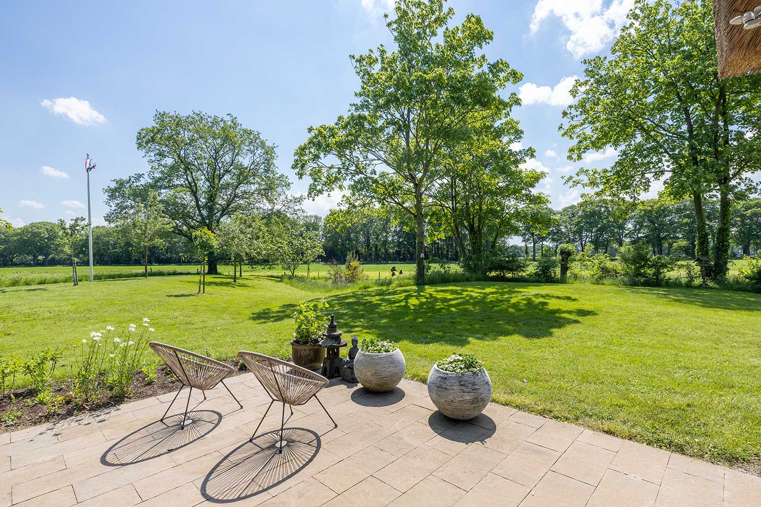 De licht golvende tuin is een waar paradijs: prachtige zichtlijnen, glooiende gazons en fenomenaal uitzicht op het kenmerkende Achterhoekse coulisselandschap rondom.