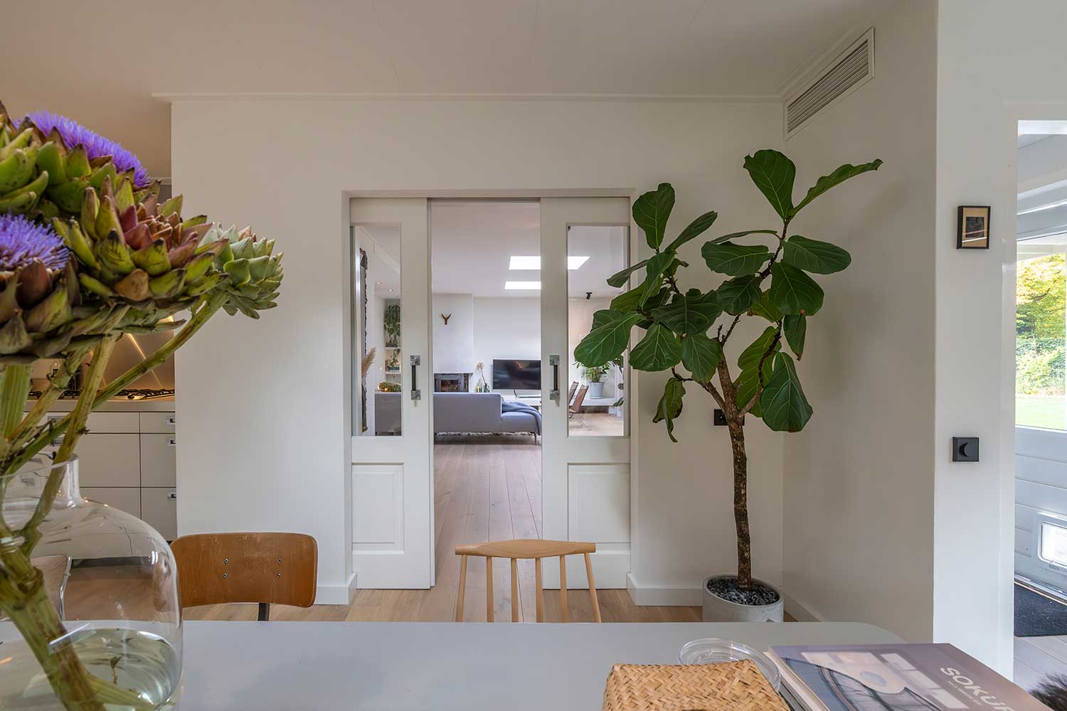 En suite deuren verbinden de living met de royale keuken met eetgedeelte. De brede eikenhouten vloer brengt deze ruimtes samen tot één geheel.
