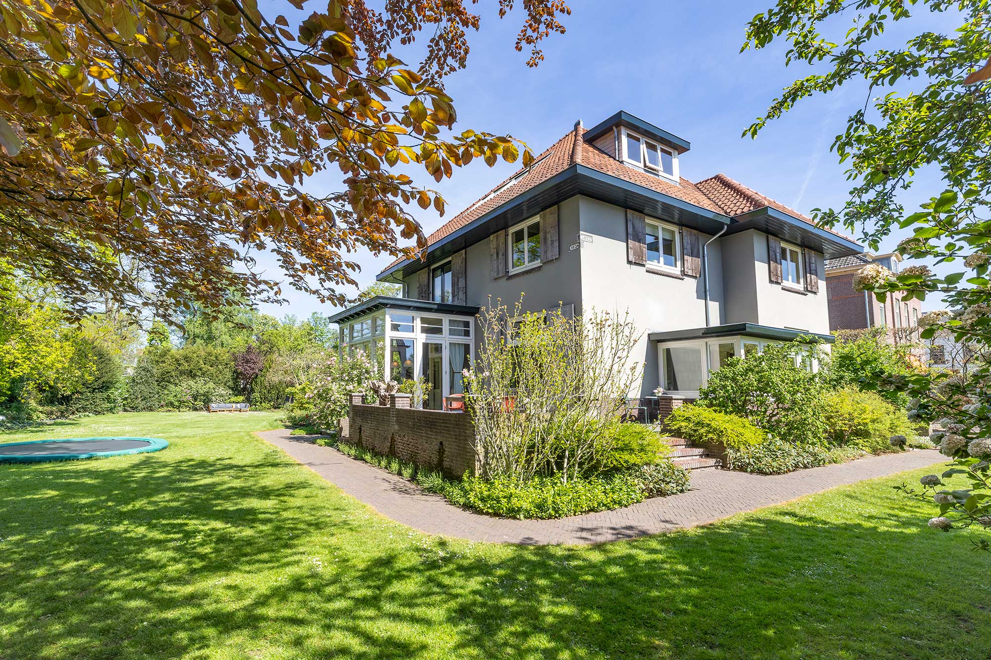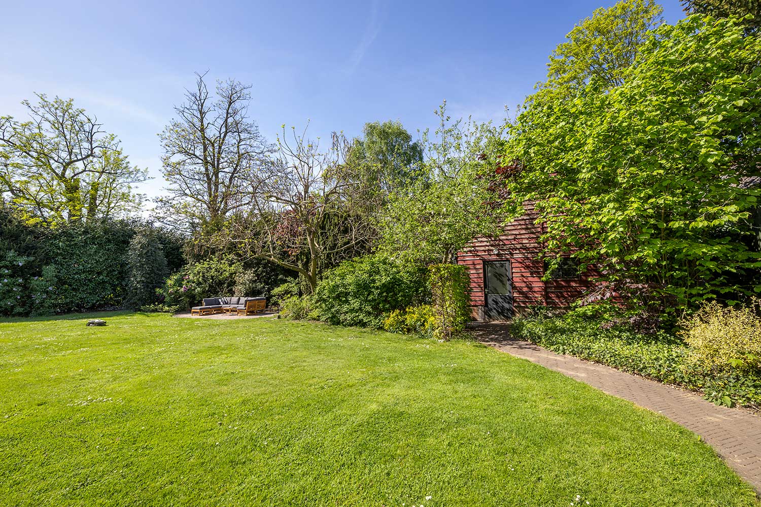 Royale verborgen tuin van 3.020 m2. Externe schuur/garage voor 4 auto’s met 2e oprit.