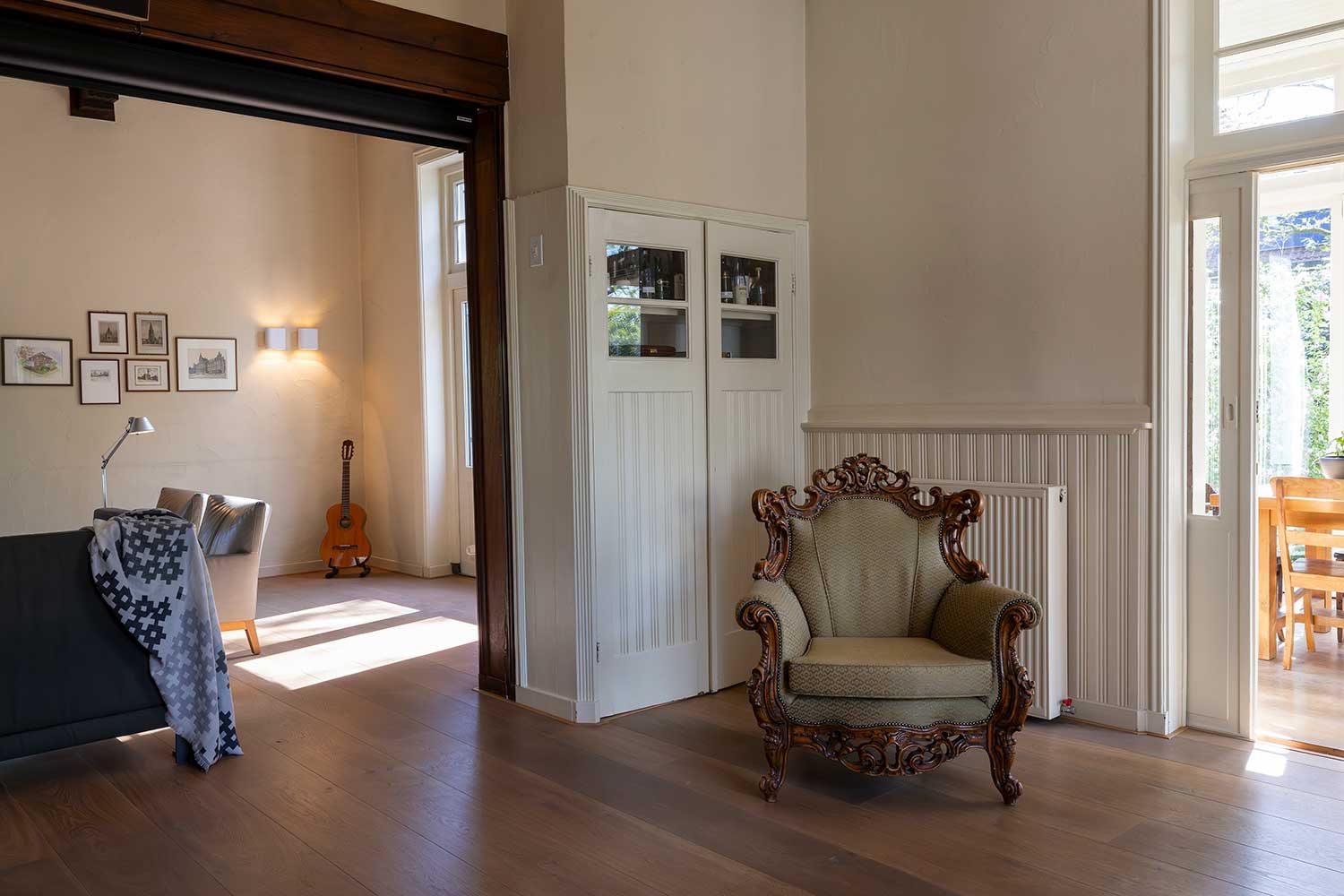 De ruime living met parketvloer heeft een eetgedeelte en een zitgedeelte bij de haard (houtkachel) met mooie lichtinval door de erker aan de voorzijde en de openslaande deuren naar een van de terrassen.