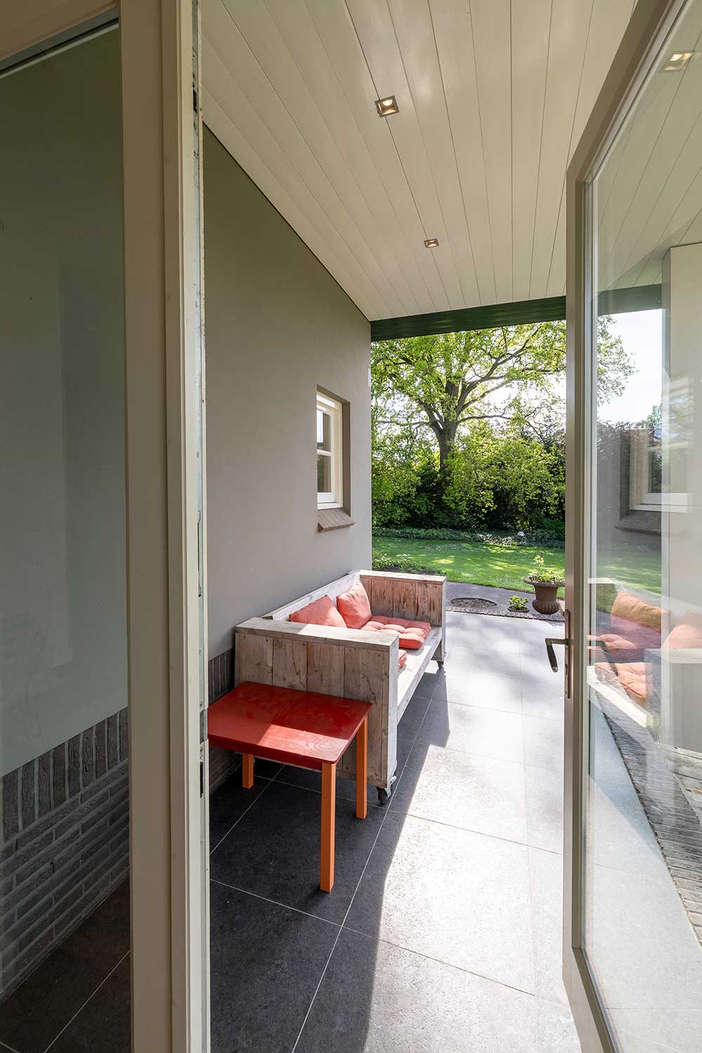 Openslaande deuren naar een overdekt terras. Ook hier veel lichtinval door de glazen pui waarvan de schuifdeuren helemaal opengezet kunnen worden en u het gevoel heeft buiten te zitten.