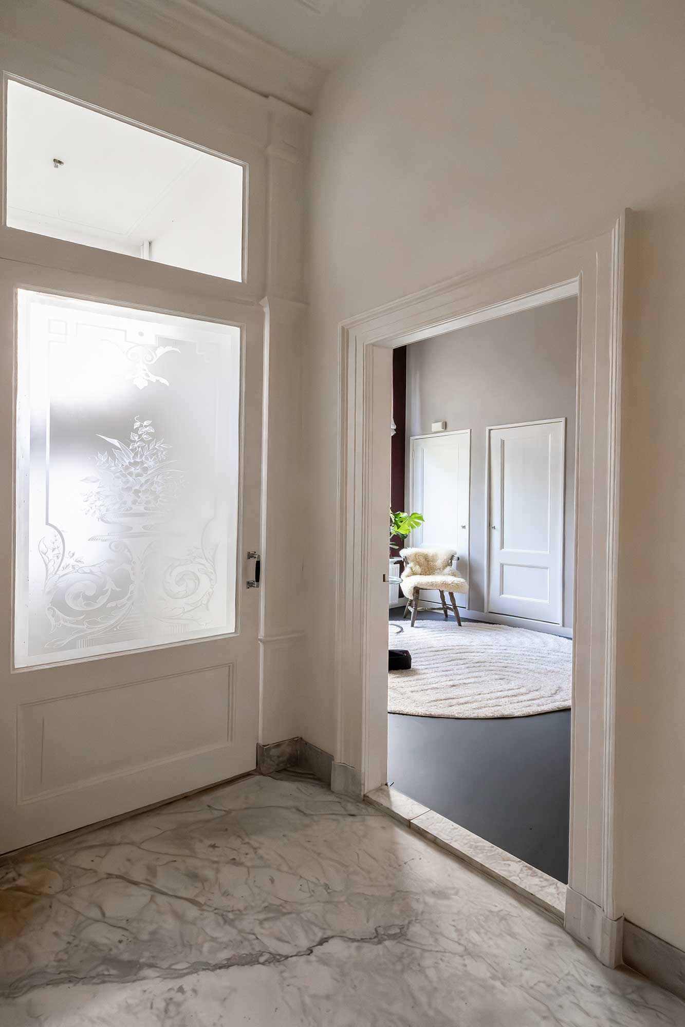 In de hal – met marmeren vloer – bevindt zich het imposante trappenhuis en de toegang tot de diverse woonruimten, het gastentoilet en het souterrain.